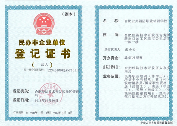 合肥云邦消防职业培训学校的发展目标是探索适合我国消防产业特点的继续教育运作模式,通过新颖实用的教材、科学的教学方法和严格的管理制度,建立以培养复合型人才为目的的培训体系。努力将培训学校建设成为国内倡导者、与国际接轨的承担防火灭火、应急救援专业培训和社会科普的中心;集实战操练、模拟训练、科研测试、专业进修、学术研讨为一体的国际化教学科研中心;消防和应急救援专业工作者成长发展的摇篮,为实现创新式、特色式发展,为消防培训事业做出新的、更大的贡献!