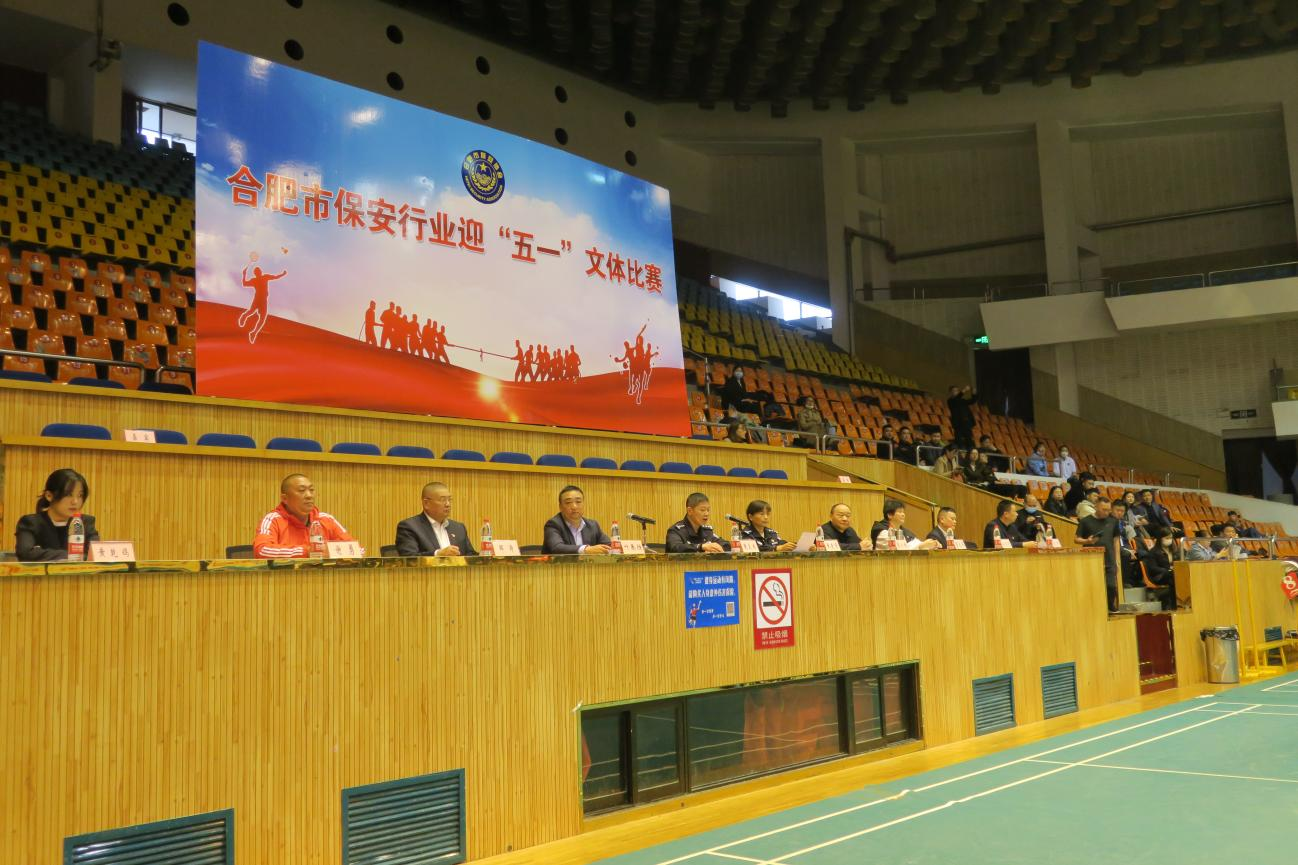 2023年4月25日下午,合肥市保安行业迎“五一”文体比赛在安徽省体育馆如期举行。全市38支参赛队伍,328名参赛人员同台竞技。举办此项赛事旨在丰富保安队伍文化生活,促进保安从业人员体能提升,增强团队协作能力和集体荣誉感。市公安局治安警察支队、保安管理处领导,以及协会班子成员、全体参赛选手和裁判员代表参加开幕式。市公安局治安警察支队副支队长蒯家球致辞并宣布比赛开始。
