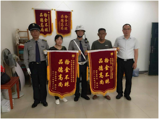 图为失主吴先生向派驻保安员送来锦旗