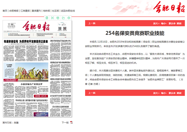 上一篇:11.18合肥晚报A06版:报道合肥市2019年保安员职业技能竞赛