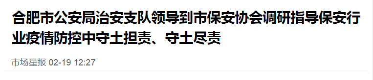 市场星报2月19日报道——合肥市公安局治安支队领导到市保安协会调研指导保安行业疫情防控中守土担责、守土尽责