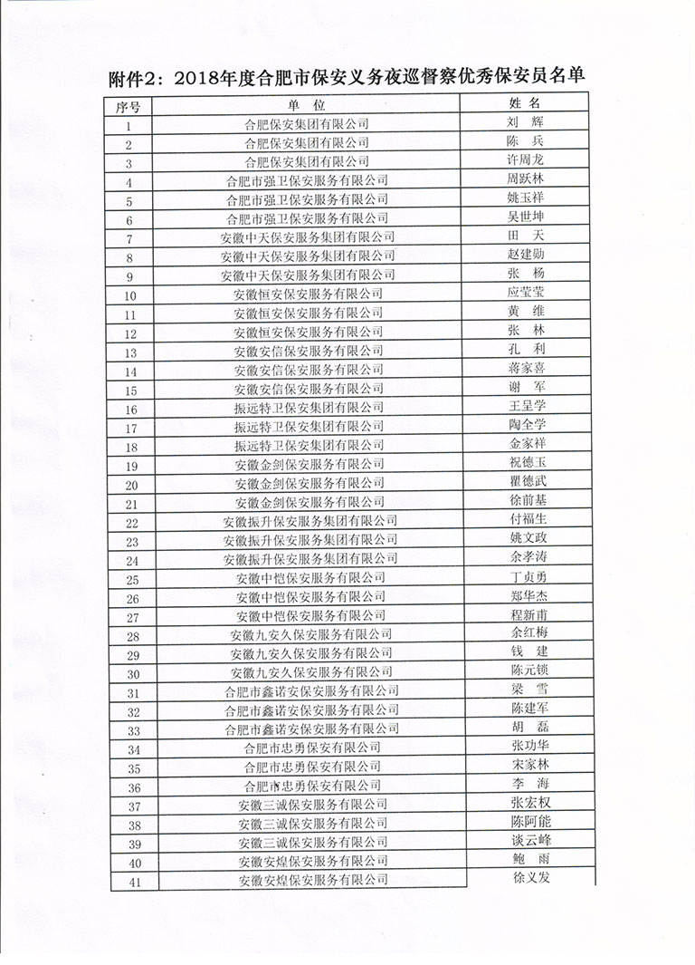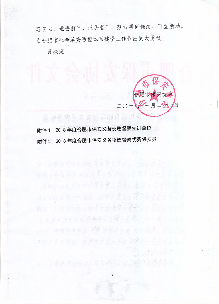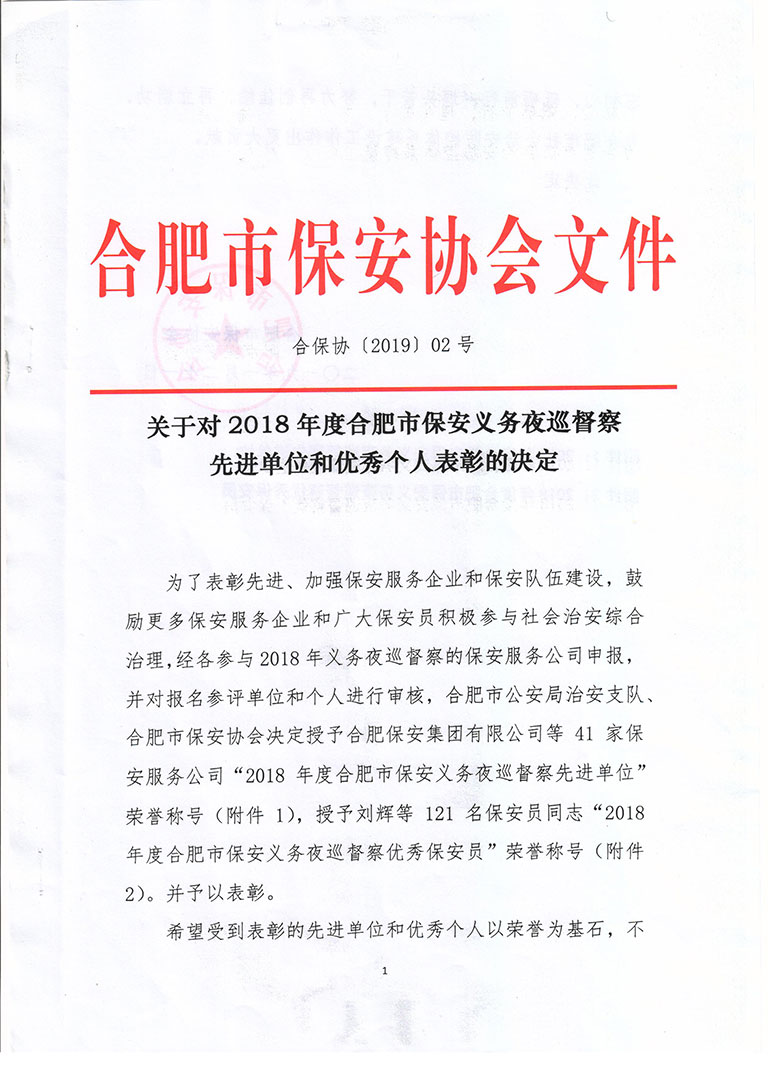 关于对2018年度合肥市保安义务夜巡督察先进单位和优秀个人表彰的决定